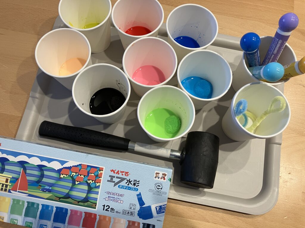紙コップに水彩絵の具を入れてあらかじめ水で薄めておきます。水っぽくするとたくさん飛び散って楽しいですが乾きにくかったので、濃さは大人が調節してあげてください。そこにフェルトボールを沈めておきます。