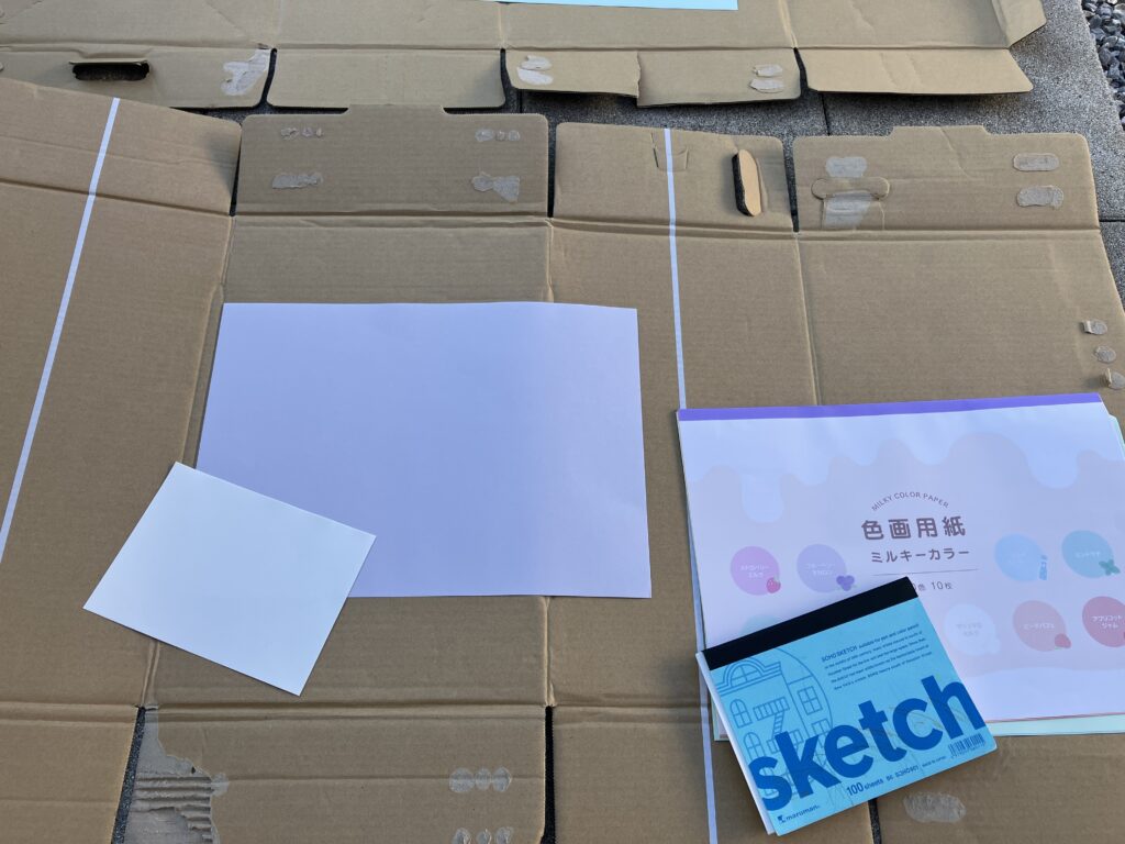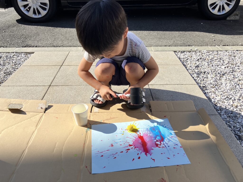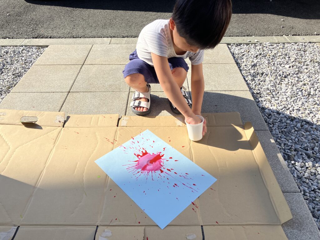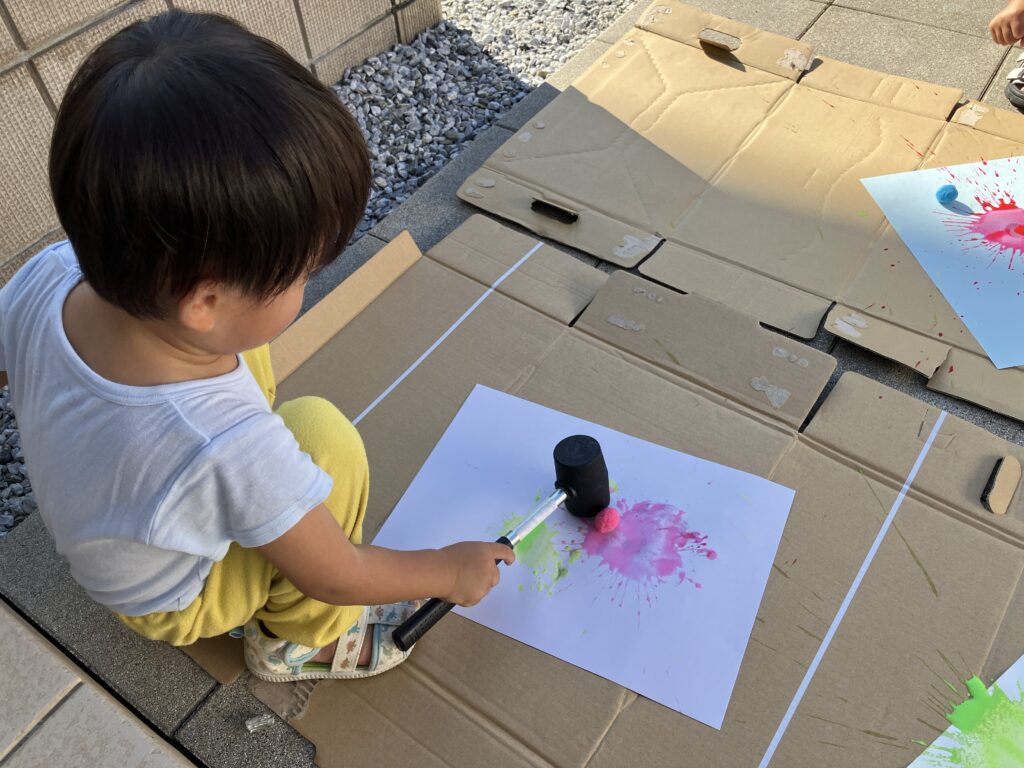 子どもたちに汚れを気にせずに遊んで欲しかったので、今回は外でダンボールを敷いて、汚れても良い服装で行いました。