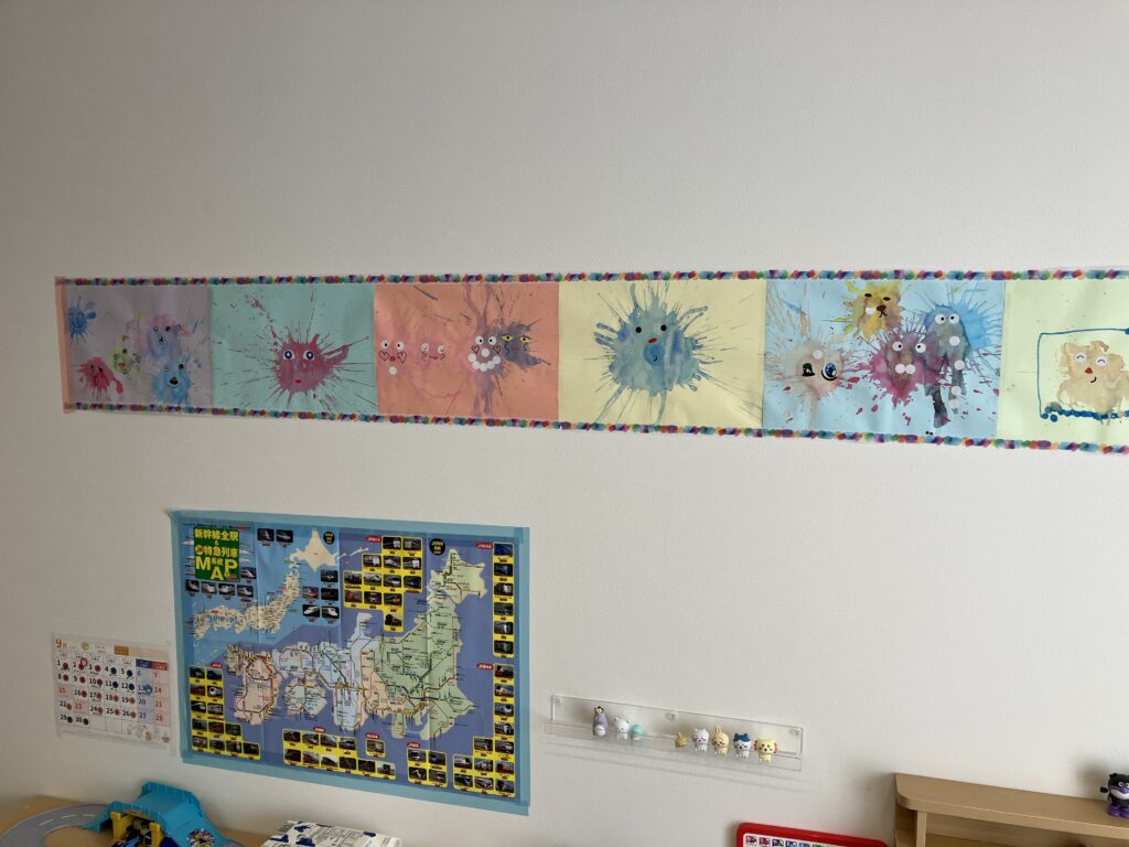 これで完成です!我が家では出来上がった作品をつなげて壁に飾りました。